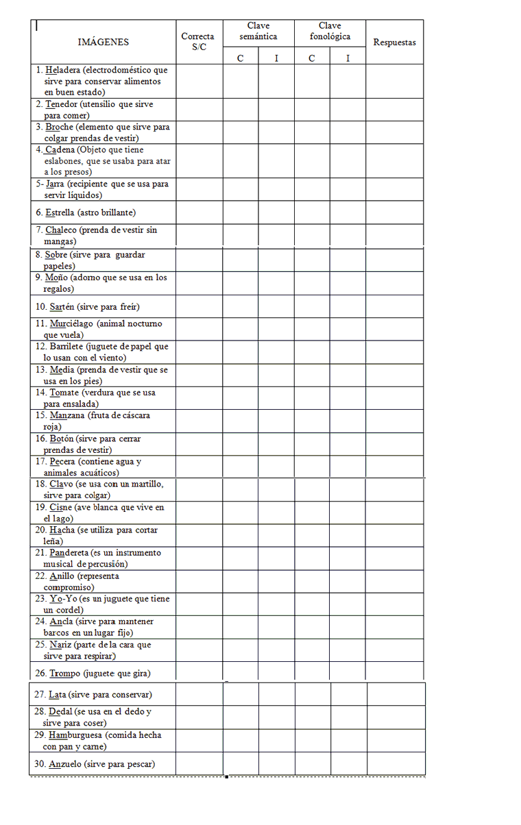 a.- se removieron las imágenes que fueran compartidas entre los distintos tests de denominación más utilizadas como el Test de Boston. Por ejemplo, Cama, Lápiz, Tijera, Peine, Escoba, Aguja, Hamaca, Percha, Helicóptero, para obtener una prueba con imágenes novedosas y no afectar a la prueba de validez convergente.