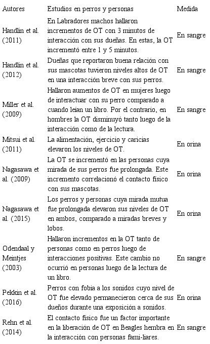 Los estudios de OT pueden dividirse entre aquellos que miden sus concentraciones en orina y/o sangre antes y después de interacciones, y aquellos que miden los efectos tras su administración nasal. Respecto de los primeros, en intercambios de larga duración se hallaron incrementos de OT en ambas especies luego de interacciones positivas entre ellos, y estos cambios fueron aún mayores cuando se enfatizó el contacto físico y verbal. A su vez, la mirada mutua de los perros y las personas, junto con la calidad de vínculo entre ellos, se asoció a niveles elevados de la sustancia. En cuanto a las interacciones breves, es clave el contacto físico ya que con tan solo 3 minutos se lograron incrementos de la hormona (Handlin et al., 2011).