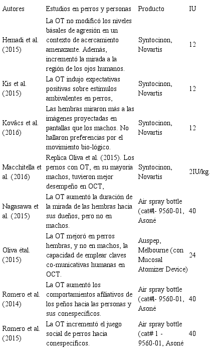 A continuación se presentarán los trabajos que midieron los efectos fisiológicos y/o conductuales de la administración exógena de OT en los perros domésticos (ver Tabla 2). En estos estudios, se realiza una aplicación de OT en las fosas nasales del animal y se comparan sus efectos en relación a controles a los que se les aplica solución salina. Estudios previos mostraron que este modo de administración incrementa las concentraciones plasmáticas de la misma sustancia (Romero, Nagasawa, Mogi, Hasegawa, & Kikusui, 2014), atravesando la barrera hematoencefálica y alcanzando su efecto en el sistema nervioso central (Born et al., 2002; Quintana, Alvares, Hickie, & Guastella, 2015).