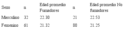 Edades promedio según sexo y presencia de hábito tabáquico.