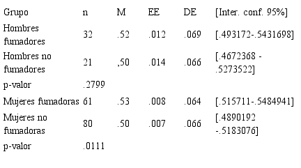 Al comparar los resultados de alpha ratio entre mujeres fumadoras y no fumadoras con un 95% de confianza, se encontró evidencia que indica que existen diferencias significativas entre sus medias (ver Tabla 4).