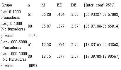 Al comparar los valores de Leq 0-1000 entre las mujeres que fuman y no fuman, no se encontró diferencia significativa entre sus medias, pero sí entre los valores Leq 1000-5000 Hz (ver Tabla 5).