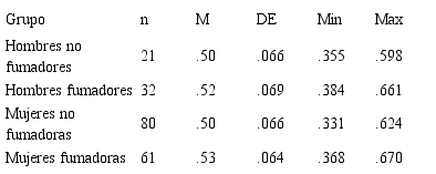De la caracterización del grupo de estudio, se destaca el hecho de que los hombres fuman en promedio aproximadamente 2 cigarrillos diarios más que las mujeres, no existiendo diferencias importantes en cuanto a la edad entre los grupos, ni entre los años de hábito tabáquico entre hombres y mujeres.