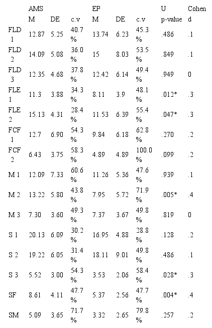 Como muestra la Tabla 2, en cuanto a los totales, en cada una de las pruebas el grupo AMS mostró desempeños promedio más altos que el grupo EP, a excepción de las tareas de letra designada, en las que las medias son similares o levemente superiores. En la desviación estándar y coeficientes de variación se observa que ambos grupos se comportan de manera heterogénea. Se encontraron diferencias significativas en la comparación de medias solo en las pruebas fonológicas de fonema excluido (FVFLE1: p = .012 y FVFLE2: p = .047), en la morfosintáctica de categorías adjetivas (FVM2: p = .005), en la de relaciones sinonímicas (FVS3: p = .028) y en la de campo léxico y fonología (FVSF: p = .004).
