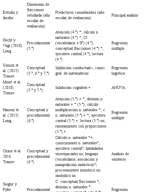 Por último, la mayor parte de los estudios revisados señala que el ejecutivo central no predice el conocimiento procedimental de las fracciones en 4.º, 5.º, 6.º y 7.º año (Bailey et al., 2014; Hansen et al., 2015; Hetch y Vagi, 2010; Namkung y Fuchs, 2016; Siegler y Pyke, 2013; para resultados diferentes en 4.º año ver Jordan et al., 2013 y en 8.º año Siegler y Pyke, 2013), cuando se consideran otras variables, tales como la atención (Hansen et al., 2015; Hecht y Vagi, 2010; Namkung y Fuchs, 2016), el lenguaje (Namkung y Fuchs, 2016), la capacidad de cálculo con números naturales (Bailey, 2014) y el conocimiento de dichos números (Hansen et al., 2015) en los modelos explicativos.