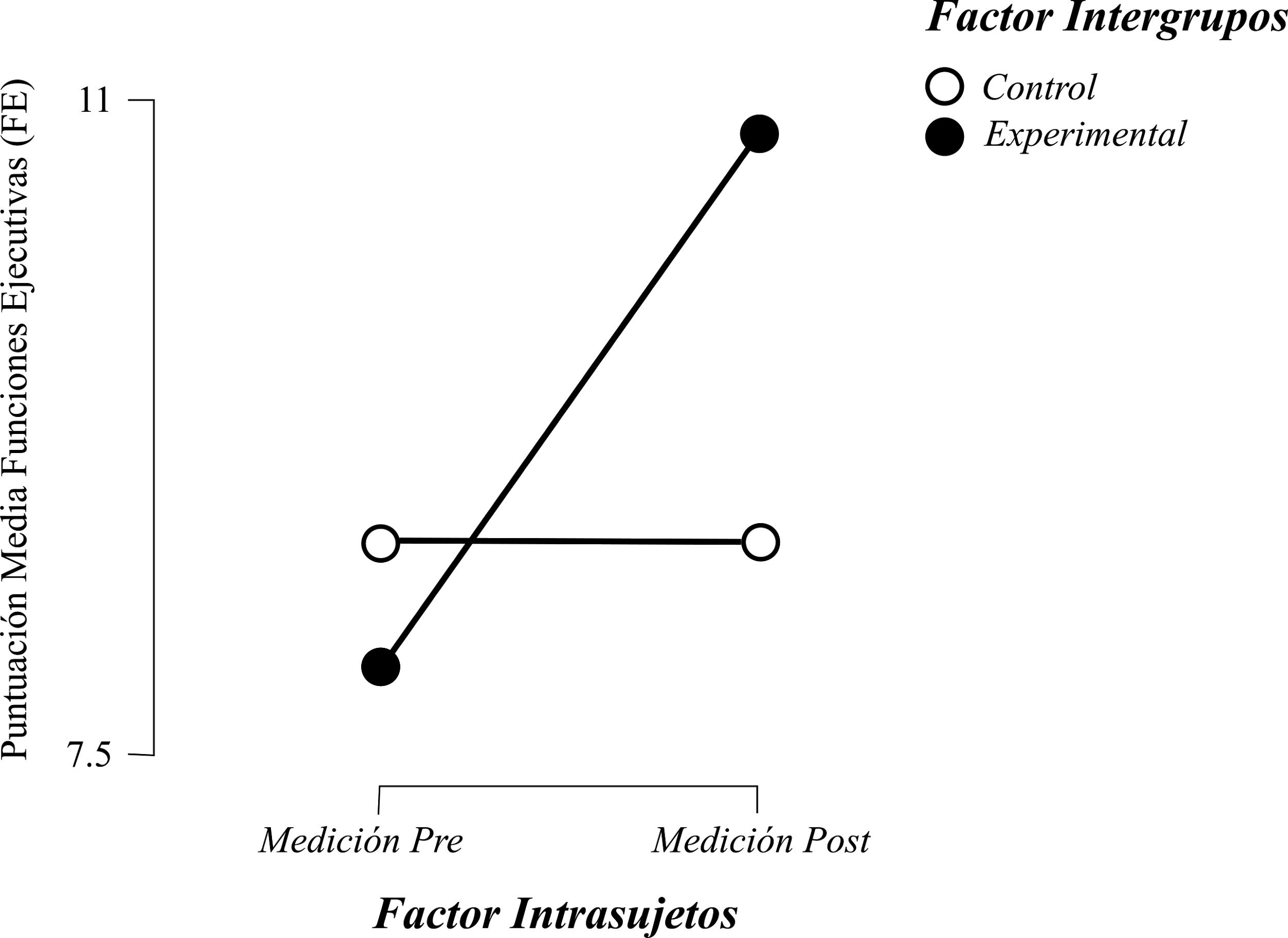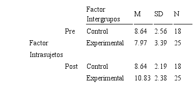 Las medias (.) y desviaciones estándar (DS) para las FE y rendimiento académico (RA) son expuestas en las Tablas 1 y 2, respectivamente. Estos estadísticos descriptivos se exponen para ambos factores de manera simultánea, es decir, intergrupo (i.e., Control vs. Experimental) e intrasujeto (i.e., Pre vs. Post).