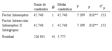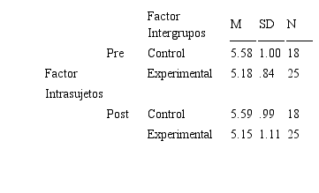Para contrastar los efectos principales de los factores intergrupos, intrasujetos y de interacción, se efectuó un análisis de la varianza mixto (ANOVA mixto). Para todas las pruebas de hipótesis efectuadas se consideró un nivel de significancia α = .05. Previo a la realización de los análisis estadísticos inferenciales se efectuó el respectivo contraste de los supuestos a la base de las pruebas paramétricas. En particular, normalidad univariada (Shapiro-Wilk) y homogeneidad de las varianzas (Levene test). La prueba de esfericidad (W de Mauchly) no es requerida, en tanto el factor intrasujeto tiene solamente dos mediciones (pre y post) y en ese caso especial, el supuesto de esfericidad se cumple siempre.