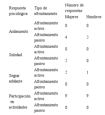 El hallazgo de una interacción entre tipo de respuesta y afrontamiento revela que algunas respuestas psicológicas en particular llevan a un afrontamiento activo o por el contrario, lo dificultan. Las respuestas que se encontraron significativas fueron aislamiento, soledad, seguir adelante y participación en actividades (Ver Tabla 1).