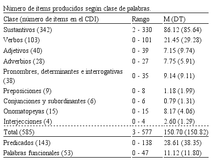El número promedio de ítems de cada clase que produjeron los niños (N = 104) fue el siguiente: Sustantivos, 86.12 (DT = 85.64); Verbos, 21.45 (DT = 29.28); Adjetivos, 7.15 (DT = 9.74); Adverbios, 7.75 (DT = 5.91); Pronombres, determinantes e interrogativas, 9.14 (DT = 9.11); Preposiciones, 1.18 (DT = 1.99); Conjunciones y subordinantes, .79 (DT = 1.31); Onomatopeyas, 8.17 (DT = 4.06); e Interjecciones, 2.60 (DT = 1.29). Además, el promedio total de ítems de las clases evaluadas que produjeron los niños fue de 150.70 (DT = 150.82). La Tabla 1 ofrece más información sobre la distribución del vocabulario.