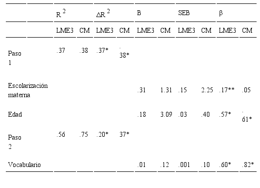 En primer lugar, se realizaron regresiones múltiples jerárquicas para evaluar si el vocabulario predecía el nivel de desarrollo gramatical. Se llevaron a cabo dos regresiones equivalentes, con distinta variable dependiente: en el primer caso, con LME3 y, en el segundo, con Complejidad morfosintáctica. Ambas regresiones se realizaron en dos pasos. Como se buscaba controlar el efecto de Edad y Escolarización materna, estas variables se introdujeron en el primer paso. En el segundo paso, se añadió Vocabulario, porque se buscaba identificar el poder explicativo de dicha variable.