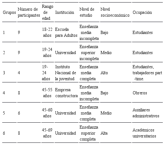 Utilizando la técnica de muestreo intencionado, se convocó la conformación de seis grupos de conversación, para responder así a la matriz definida en el diseño, y quedó la muestra final constituida por esos grupos, en los que participaron 44 hombres entre 18 y 69 años.