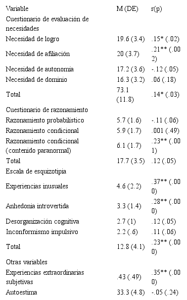 Seis variables correlacionaron significativamente con la creencia en lo paranormal a un nivel de significación de α = .01. Las puntuaciones totales de los individuos en la escala de esquizotipia y dos de sus subscalas (experiencias inusuales y anhedonia introvertida), así como la vivencia de experiencias extraordinarias subjetivas y la necesidad de afiliación, tal y como se hipotetizó, mostraron una asociación positiva con la creencia en lo paranormal (rxy = .23, p < .001; rxy = .37, p < .001, rxy = .28, p < .001, rxy = .35, p < .001, rxy = .21 y p = .002, respectivamente). Sin embargo, al contrario de lo esperado, las puntuaciones de los sujetos en las tareas de razonamiento condicional con contenido paranormal mostraron una correlación positiva significativa con las puntuaciones en la escala de creencias paranormales (rxy = .23, p = .001).