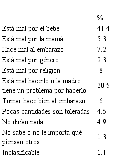 Un 6 % consideró que las personas importantes para ellas aprobarían el consumo, ya sea porque pocas cantidades son toleradas (4.5 %) o porque el alcohol hace bien, por ejemplo a la lactancia (.6 %). Un 5 % manifestó que las personas importantes para ellas no dirían nada y un 1 % que les sería indiferente lo que le dijeran. En la Tabla 2 se presentan las categorías de normas sociales prescriptivas completas.