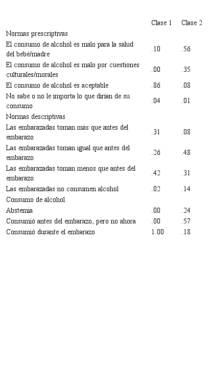 El análisis de clases latentes indicó un mejor ajuste del modelo de dos clases (AIC = 5 162.19, BIC = 5 242.12) frente al de tres (AIC = 5 171.12, BIC = 5 293.37) y cuatro clases (AIC = 5 181.67, BIC = 5 346.24). La proporción estimada fue de 3 % para la Clase 1 y de 97 % para la Clase 2. Como se observa en la Tabla 3, la Clase 1 estuvo compuesta casi exclusivamente por mujeres que afirmaron que, para las personas de su entorno, el consumo de alcohol en el embarazo era aceptable, pensaban que las embarazadas consumían más, lo mismo o menos que antes de enterarse de su estado gestacional, y ellas mismas consumían alcohol estando embarazadas. Al contrario, la Clase 2 conglomeró a las mujeres que pensaban que los demás verían como malo su consumo, ya fuera por su salud o la del bebé, o por cuestiones culturales o morales. Muy pocas afirmaron que las embarazadas tomaban más en el embarazo, pero sí que tomaban lo mismo, menos, o que no consumían alcohol luego de enterarse de su estado gestacional. Ellas mismas habrían consumido antes del embarazo o eran abstemias, pero existió una probabilidad baja de que consumieran durante la gestación.