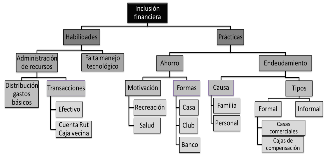 La segunda categoría que emerge en este núcleo es prácticas, la que da cuenta de las acciones que realizan de manera constante, conforme a ciertas reglas y aplicando ciertos conocimientos del ámbito económico. Emergen bajo esta categoría las prácticas asociadas a ahorro y endeudamiento.