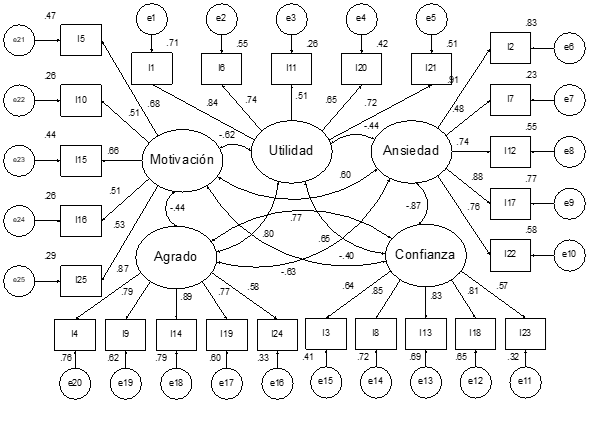 Todos los parámetros fueron significativos. Los factores ansiedad (AVE = .59 y ω = .87), confianza (AVE = .56 y ω = .86) y agrado (AVE = .62 y ω = .89) mostraron validez convergente (AVE > .50) y valores de consistencia interna buenos (.80 ≤ ω < .90). El factor de utilidad tuvo una AVE de .49 y consistencia interna buena (ω = .82). No obstante, el factor de motivación no mostró validez convergente (AVE = .34 < .50) y su consistencia interna fue aceptable (.70 ≤ ω = .72 < .80).