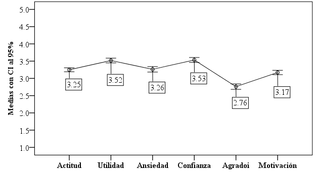 La tendencia central (media aritmética, mediana y moda) de los factores de utilidad y confianza reflejó una actitud de aceptación (≥ 3.4). No obstante, los valores de tendencia central de la escala y los factores de falta de ansiedad, agrado y motivación quedaron en el intervalo [2.6; 3.4), que corresponde a una actitud neutra (Tabla 1).