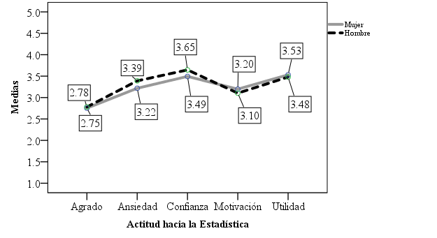 El tercer objetivo buscado por el estudio fue comparar los promedios entre los factores y entre ambos sexos. Por los estudios de Flores y Auzmendi (2015) y Vilá y Rubio (2016) cabría esperar un promedio más alto en ansiedad (poca ansiedad) y los más bajos en agrado, motivación y confianza. Los presentes datos no confirman estos resultados. Hubo diferencias significativas entre medias, pero las más altas fueron en utilidad y confianza y la más baja fue en falta de ansiedad. Estos alumnos mexicanos de psicología sí valoran la estadística como útil y se sienten confiados en su aplicación, pero no están exentos de ansiedad ante ella.