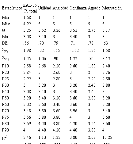 Las puntuaciones en utilidad, falta de ansiedad, confianza y agrado mostraron perfiles acampanados, simétricos y mesocúrticos en los histogramas, por lo que se ajustaron a la normalidad. En el perfil de la puntuación total del EAE-25 acampanado y simétrico, hubo muy ligera asimetría positiva (ZK3 = 1.98), pero se pudo mantener la hipótesis nula de normalidad. El factor de motivación presentó ligera leptocurtosis, lo que provocó desviación de la normalidad (Tabla 1).