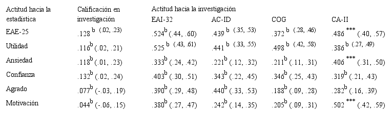 Las correlaciones de la puntuación total y de los factores de utilidad, ansiedad y confianza con la calificación en la materia de investigación del semestre anterior fueron significativas, positivas y con una fuerza de asociación pequeña. Agrado y motivación fueron independientes, como se observa en la Tabla 2.