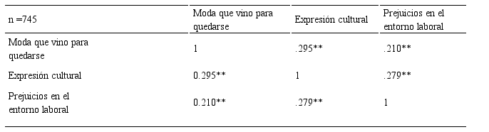 Con respecto a la idea de que los tatuajes son una moda que vino para quedarse y la percepción de que existen prejuicios en el entorno laboral relacionados con su uso, la correlación es menor que las anteriores, pero permite entender que existe una considerable relación entre las variables (correlación del 21 %). En este sentido, el concepto de moda explicado por Gil Mártil (2009), es decir, la consideración de que algo es moda cuando la mayoría en un grupo así lo cree, se relaciona con el hecho de que los distintos grupos culturales poseen diferentes consideraciones en cuanto a qué se considera aceptable a la hora de ocupar un puesto de trabajo.