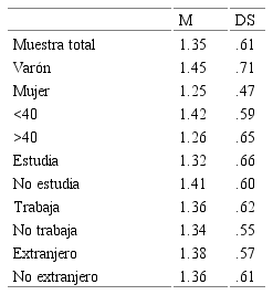 Una vez validado el índice, y con el objetivo de identificar los usuarios de redes sociales que tenían conductas disruptivas online, se analizó la relación entre la intensidad de la conducta disruptiva online mediante el índice diseñado y algunas variables sociodemográficas de interés (sexo, edad, si estudiaba o no, si trabajaba o no y si era extranjero o no). Para analizar la relación con las variables discretas se diseñó una nueva variable dummy tomando el primer cuartil (bajo en conductas disruptivas online) y tercer cuartil (alto en conductas disruptivas online). Se encontraron asociaciones significativas entre las conductas disruptivas online y el sexo de los participantes [χ2 (1, 858) = 9.03, p = .007], si estudiaba o no [χ2 (1, 858) = 8.14, p = .01] y la edad [t (1, 856) = 4.29, p < .0001]. No se encontraron asociaciones entre las conductas disruptivas online y si trabajaba o no [χ2 (1, 858) = .23, p > .05] y la nacionalidad [t (1, 856) = .096, p > .05]. Por lo tanto, en la muestra analizada, las conductas disruptivas online aparecen más frecuentemente entre los varones que no estudian y que son más jóvenes. El grupo que puntuaba alto en conductas disruptivas tenía en promedio 35.88 años (DS = 13.77; ver Tabla 1).