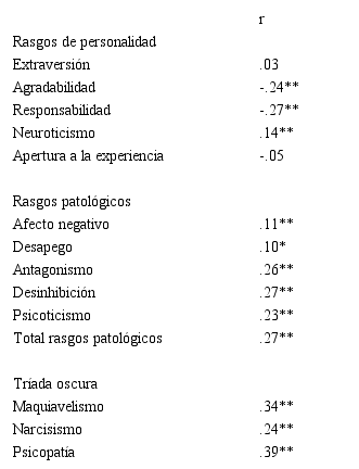 Conductas disruptivas online y rasgos de personalidad (normales, patológicos, y rasgos vinculados a tríada oscura)