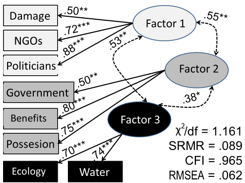 Only two firms had more than one mining project (none exceeded two) in the 2008-2017 period. Considering the number of years under conflict, the firms were categorized into Low Conflict (0-1 year, N = 14), Medium Conflict (2-7 years, N = 15), and High Conflict (8-10 years, N = 14). Conflict level correlated .96 (p < .001, two-tailed) with raw number of years under conflict. Only 12 firms had their shares transacted in the Lima Stock Exchange; 14 were national and 29 international companies. The 11 items entailing source of socio-environmental conflicts were submitted to an exploratory factor analysis using Principal Components Analysis; the resulting 3-factor solution explained 63 % of the variance and suggested a structure whose model fit was satisfactory according to the semi-confirmatory FACTOR program (Ferrando & Lorenzo-Seva, 2017) using unweighted least squares (see Appendix 1) as well as according to a confirmatory factor analysis using maximum likelihood in AMOS 24.