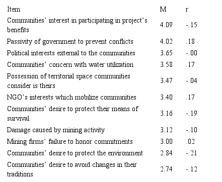 It can be seen in Table 1 that the managers attributed the causes of socio-environmental conflicts mainly to the external political agents encompassed by Factor 1; attributions to mining firms came in 8th and 9th places. All the partial correlations between managers’ ratings and the firm’s level of conflict were non-significant. Factor 3 (M = 3.21, SD = .80) presented lower scores than Factor 1 (M = 3.39, SD = .82) and Factor 2 (M = 3.43, SD = .73), but the differences were not significant.