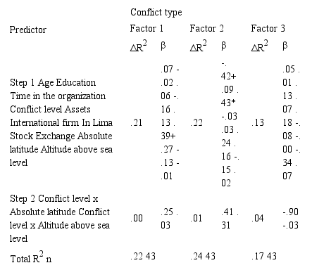 The results of hierarchical multiple regression analyses shown in Table 2 failed to uphold hypotheses 1 and 3: neither conflict level nor its interactions with latitude or altitude explained managers’ perceptions of sources of socio-environmental conflicts.