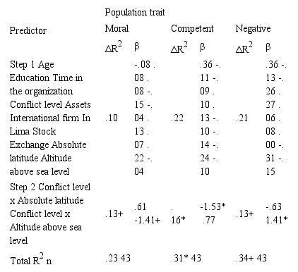 On the other hand, geography emerged as an important moderator of the relationship between the level of socio-environmental conflict experienced by the mining firm and managers’ perceptions of the surrounding populations. Greater attributions of competence were associated with the experience of conflict only when the mine was located in northern Peru. Since lower intelligence of the general population has been demonstrated for northern than southern Peru (León, 2015; León & Burga León, 2014), this finding suggests that the emergence of conflict may have modified managers’ perception of the surrounding population as incompetent, which would have not occurred in southern Peru because its population was not seen in such negative terms. In turn, the presence of socio-environmental conflict emerged associated with a view of the surrounding population as less moral, more negative at high altitude. Since national/regional stereotypes in Peru assign weaker morality and more negativity to peoples residing at high altitude, who are mainly Amerindians (Huayhua, 2014; Weismantel & Eisenman, 1998), these results suggest that mining managers more affected by socio-environmental conflict strengthened such stereotypes in response to the external challenge.