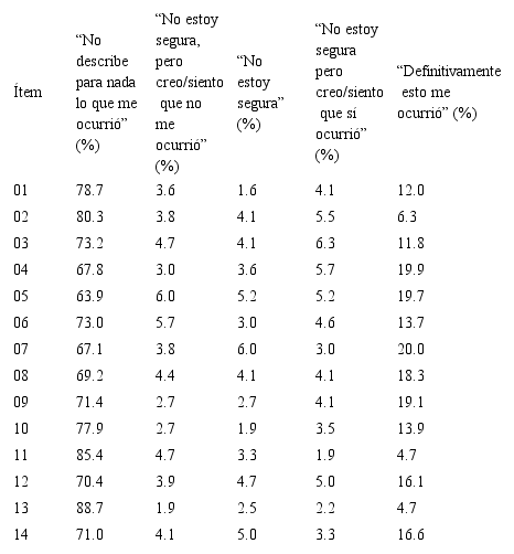 La escala final consta de 14 ítems en formato Likert con cinco opciones de respuesta (que van desde 1 = No describe para nada lo que me ocurrió, hasta 5 = Definitivamente esto me ocurrió; ver Anexo). La redacción de los ítems fue revisada por un grupo de expertas del área de la salud de las mujeres. Dicho panel contribuyó a mejorar la redacción de los reactivos y hacer que estos resultaran representativos de las situaciones más corrientes reportadas en estudios previos sobre problemas de salud ginecológica y del ámbito obstétrico. El panel fue conformado por diversas mujeres que trabajan en colectivos sobre derechos reproductivos y VO (entre las que había matronas, enfermeras, abogadas y activistas) que revisaron el instrumento y realizaron los comentarios pertinentes.