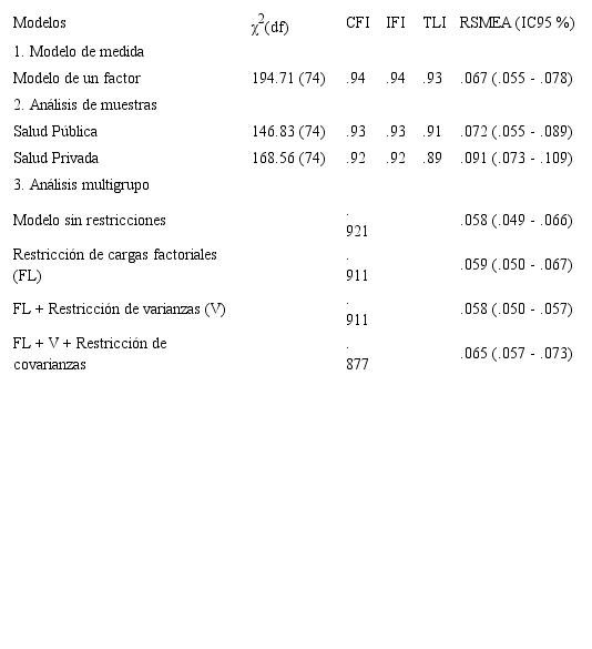 Se realizaron dos análisis factoriales confirmatorios separados para las mujeres que habían tenido sus partos en instituciones públicas o privadas (ver Tabla 2). El modelo unifactorial proporcionó un buen ajuste para ambos: salud pública: χ2(74) = 146.83, p < .001, CFI = .93, IFI = .93, TLI = .91 y RMSEA = .072; salud privada: χ2(74) =168.56, p < .001, CFI = .92, IFI = .92, TLI = .89 y RMSEA = .091. La realización de análisis separados supone que la VO se produce indistintamente del tipo de centro en el que las mujeres atienden sus partos y que, por lo mismo, la escala debe servir para captar el significado de dicha violencia en instituciones públicas o privadas. Los índices de ajuste mostraron valores adecuados para los dos grupos, lo que sugiere que el modelo de un factor general puesto a prueba resulta pertinente para detectar VO en mujeres que se atienden en ambos tipos de instituciones (públicas y privadas), aunque si atendemos a los resultados referidos al error cuadrático medio de aproximación (RMSEA), estos son ligeramente mejores en el caso del grupo atendido en la salud pública, lo cual podría explicarse por el bajo tamaño muestral y el elevado número de parámetros a estimar.