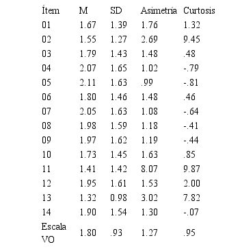 La escala de VO muestra un coeficiente de confiabilidad de .83 (alfa de Cronbach) para el conjunto de los ítems. Las correlaciones de los ítems con el total fluctúan en un rango entre .29 y .71. Del mismo modo, la fiabilidad obtenida con base en las cargas factoriales (omega) fue de .88. Las cargas factoriales fluctuaron entre .26 y .78.