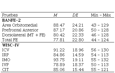 Con respecto a la distribución de las categorías a partir de las puntuaciones totales obtenidas en las pruebas WISC-IV y BANFE-2, se observó que la mayoría de los participantes se ubicaron por debajo de la categoría media. En cuanto a BANFE-2, la mayoría de la muestra (61 %) se ubicó entre las categorías alteración severa (44 %) y leve (17 %), mientras que la parte restante (39 %) entre las categorías normal (33 %) y normal alto (6 %). En WISC-IV se observó que el 33 % obtuvo una puntuación en la categoría medio, mientras que el 67 % obtuvo una puntuación inferior: medio bajo (22 %), inferior (22 %) y extremadamente bajo (17 %); por último, solo el 6 % obtuvo puntuaciones por encima de la categoría medio: medio alto (3 %) y superior (3 %).