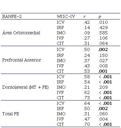 Los resultados de correlación entre las subpruebas de BANFE-2 y WISC-IV mostraron correlaciones significativas entre la mayoría de las subpruebas (Tabla 2). En todos los casos se encontraron correlaciones significativas positivas. El 69 % de las correlaciones significativas (p < .05) resultó tener un grado de asociación moderada/fuerte (i. e., 49 < r(35) < 73), mientras que el resto de las correlaciones mostró un grado de asociación débil (i. e., 37 < r(35)< 50). Asimismo, las subpruebas que estuvieron menos relacionadas con el resto de las subpruebas fueron las involucradas en el Área Orbitomedial, seguida por las incluidas en IMO e IRP. Por otro lado, tanto la puntuación total de la prueba WISC-IV como la de BANFE-2 mostraron ser las que mayormente se asociaron con las subpruebas de la BANFE-2 y de WISC-IV, respectivamente. Mientras que las puntuaciones totales (i. e., CIT y Total FE) mostraron tener mayor cantidad de asociaciones.