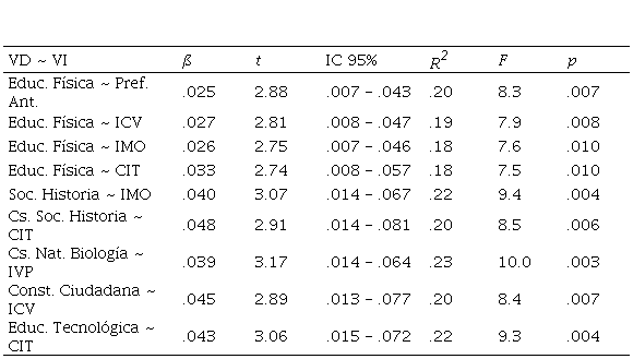 Los análisis de regresión simple se efectuaron con el objetivo de predecir el RA a partir de los puntajes en las distintas subpruebas de BANFE-2 y WISC-IV. Es decir, se generaron modelos utilizando el RA (e. g., nota en matemáticas) como variable dependiente y el desempeño cognitivo (e. g., puntuación en CIT) como variable independiente o predictora.