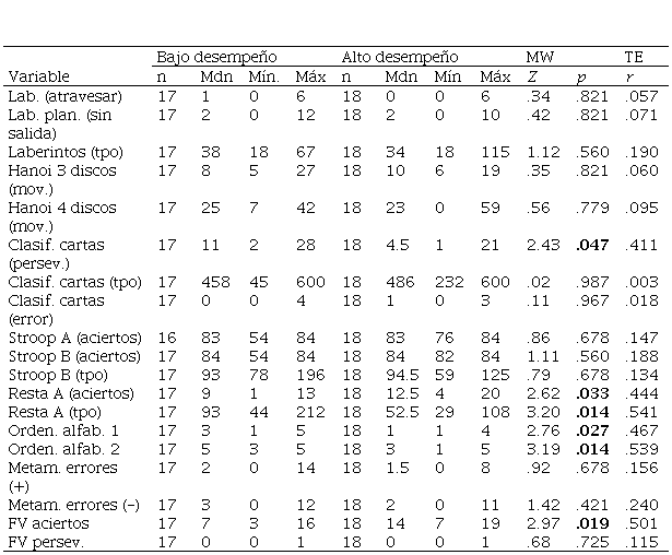 Seguidamente se muestran los análisis descriptivos y de contraste (véase Tabla 5) según grupo de estudio (i. e., alto y bajo desempeño). A partir de los análisis de correlación de Spearman las variables de BANFE-2 seleccionadas e incluidas en el presente análisis fueron las siguientes: Laberintos (atravesar), Laberintos planeación (sin salida), Laberintos (tiempo), Hanoi tres discos (movimientos), Hanoi cuatro discos (movimientos) - Planificación; Clasificación cartas (perseveraciones), Clasificación de cartas(tiempo), Clasificación de cartas (error)- Flexibilidad mental; Stroop A (aciertos), Stroop B (aciertos), Stroop B (tiempo) - Inhibición; Resta A (aciertos), Resta A (tiempo), Ordenamiento alfabético 1, Ordenamiento alfabético 2 - MT; Metamemoria errores (+), Metamemoria errores (-) -Metamemoria; FV aciertos, FV perseveraciones -Fluidez verbal.