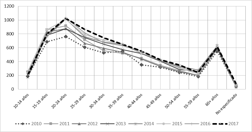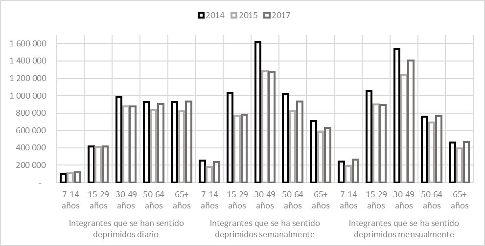 En México, el panorama sobre trastornos mentales luce alarmante aun cuando la disponibilidad de datos sobre todas las variantes de trastornos mentales es reducida. Por ejemplo, en el Instituto Nacional de Estadística y Geografía (INEGI) solo se ofrecen datos en materia de depresión y suicidios. Como se observa en el gráfico 1, la depresión es un trastorno que afecta en gran medida a la población que tiene entre 30-49 años, y que para casi todos los grupos de edad se ha ido incrementando. Ahora bien, si estos datos se desagregan por entidad federativa, la tendencia revela que la media nacional ronda el 30 %, mientras que hay estados como Durango, Michoacán, Tlaxcala y Veracruz que se pasan del 40 %, y en el ámbito regional para la Península de Yucatán, Quintana Roo se sitúa en el 12 % (con disminución de casos desde 2014 al 2017), Campeche presenta 31 % (con incremento de casos desde 2014 al 2017) y Yucatán con 28 % (con leve disminución de casos desde 2014 al 2017).