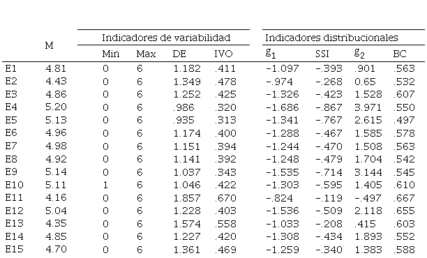 Se hizo un análisis de los ítems mediante los estadísticos descriptivos usuales. Algunos de estos se estandarizaron para mejorar la interpretación: para la variabilidad se usó el índice de variación ordinal (IVO; Berry y Mielke, 1994) y para la asimetría, el índice estandarizado de asimetría SSI (standardized skew index; Malgady, 2007). En ambos métodos, los valores cerca de 1 indican el incremento del atributo estadístico examinado. La bimodalidad se evaluó mediante el índice BC (SAS Institute, 2012), en el que valores superiores a .55 indican potencialmente distribuciones bimodales (Freeman y Dale, 2013).