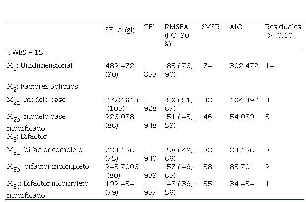 Sobre una base a priori, se probaron varios modelos probables para la estructura latente del UWES. Se verificó primero un modelo unidimensional (M1), en que la varianza de los ítems es explicada por una sola variable latente; en segundo lugar, el modelo de tres factores oblicuos (M2), que expresa el planteamiento teórico original del engagement y que, principalmente, fue la hipótesis nula de estudios previos. Se evaluó un modelo bifactor completo (M3a), que consistió en especificar dos fuentes de variación de los ítems: un factor general y tres factores específicos; finalmente, y dentro de este mismo modelo bifactor, se probó el bifactor incompleto para corroborar el reciente hallazgo de De Bruin y Henn (2013). De acuerdo a la literatura revisada (Flores et al., 2015; Schaufeli et al., 2002, 2006), era realista esperar reespecificaciones a posteriori para mejorar el ajuste, pero estas se efectuaron priorizando la magnitud de los índices de modificación (IM) y su base teórico-racional.