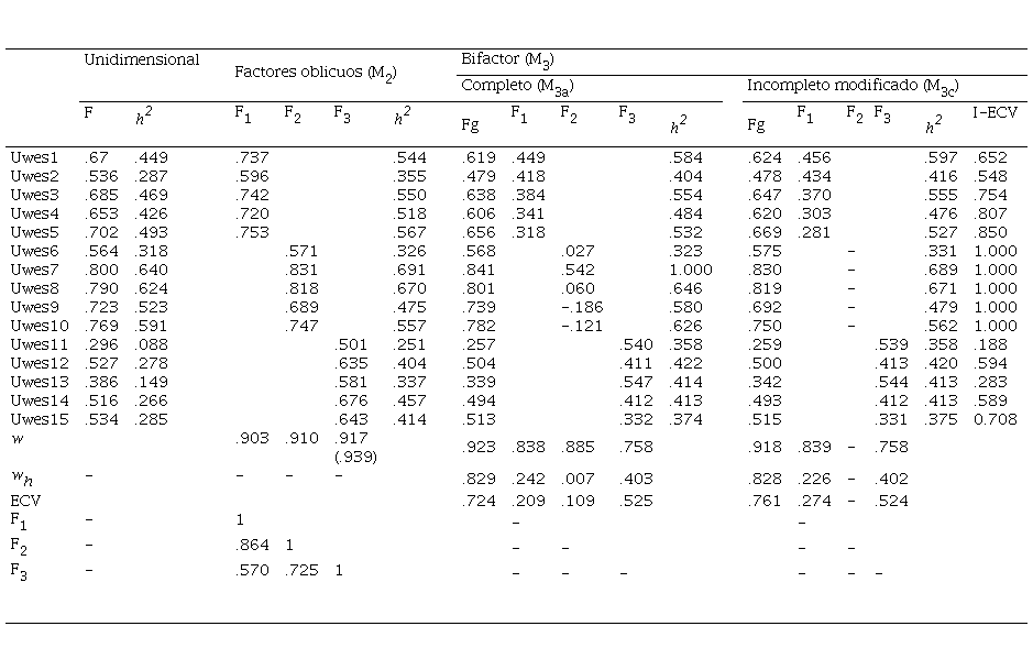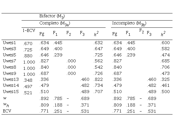 Todas las cargas factoriales del modelo final (M3c, bifactor incompleto) fueron estadísticamente significativos (z > 2.54) y las correspondientes con Fg fueron ligeramente mayores que las cargas en ambos factores específicos (Tabla 3). Por otro lado, los ítems que ahora únicamente obtenían su varianza de Fg mostraron sistemáticamente cargas elevadas. La evaluación final del modelo se hizo con la inspección del grado de sesgo de los parámetros en la introducción de un modelo bifactor (Reise, 2012; Reise et al., 2013). Se calcularon cuatro índices: el primero, la varianza común explicada (explained common variance, ECV; Reise et al., 2013), que ayuda a determinar la fuerza del factor general, y por lo tanto, unidimensionalidad. El ECV para el modelo bifactor completo (M3a) e incompleto modificado (M3c) fueron mayores a .70, el cual es un valor mínimo habitual para aceptar la unidimensionalidad (Reise et al., 2013; Rodríguez et al., 2016b). En segundo lugar, la varianza común explicada en el nivel de los ítems (I-ECV; Stucky, Thissen y Edelen, 2013), que debería ser alta. En la Tabla 3 (encabezado I-ECV), tiende a ser elevada, excepto para algunos ítems de Absorción (F3). Tercero, la proporción de correlaciones no contaminadas por la multidimensionalidad (PUC; Reise et al., 2013) fue .724. Cuarto, los coeficientes de confiabilidad ωh obtenidos (McDonald, 1999; Reise et al., 2013) para el factor general (ωh > .80) y factores específicos (ωh < .55) presentados en la Tabla 3, indican un fuerte contraste entre ellas respecto a la varianza confiable. En conjunto, estos resultados señalan que el UWES-15 puede ser interpretado desde un marco de unidimensionalidad esencial (Rodríguez et al., 2016a, 2016b), e indica que la hipótesis de estudio se aceptaría.