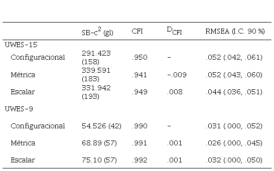 El análisis CFA inició con la especificación de errores no correlacionados entre los ítems y los ítems relacionados únicamente con el factor esperado, lo que significa que sus parámetros fueron estimados libremente y constreñidos a cero en los otros factores. Se fijó la varianza de cada factor en 1, para permitir evaluar la parametrización directa en cada ítem (Lubke y Muthén, 2004). Luego de verificar el modelo de medición apropiado del UWES, se examinó la invarianza de medición (IM) de los parámetros obtenidos mediante el procedimiento acumulativo de evaluar si el modelo cumplía varios niveles de invarianza (Meredith, 1993): configuracional (igualdad de número de constructos), débil (igualdad de cargas factoriales), fuerte (igualdad de interceptos de los ítems). Los grupos comparados para la IM fueron docentes versus no docentes, que fueron elegidos como más relevantes para examinar el impacto del tipo de trabajo sobre la propiedad de invarianza psicométrica. Se aplicó la diferencia entre CFI (DCFI ≤ .01; Cheung y Resvold, 2002) como fuente principal de evaluación de IM, dado que la diferencia SB-c. es sensible al tamaño muestral.
