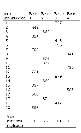 Con respecto al análisis factorial exploratorio, al retener cuatro factores, se explicaba un 56 % de la varianza. Cada uno de ellos explicaba un 16 %, 24 %, 10 % y 6 % de la varianza, respectivamente. Los resultados del análisis factorial se presentan en la Tabla 1. Como se puede observar en dicha tabla, no se replicaba la estructura de cinco factores postulada por los autores. En cambio, emergía una de cuatro factores y no existían cargas cruzadas superiores a .30. El primer factor se denominó Urgencia y se compuso de los ítems 2, 4, 7, 12, 15, 17 y 20 de la escala. El segundo factor, llamado Búsqueda de Sensaciones, se compuso de los ítems 3, 9, 10, 14 y 18. El tercer factor se denominó Falta de Premeditación y fue integrado por los ítems 1, 5, 6, 13 y 19. El cuarto factor, llamado Falta de Perseverancia, se compuso por los ítems 8, 11 y 16 de la escala.