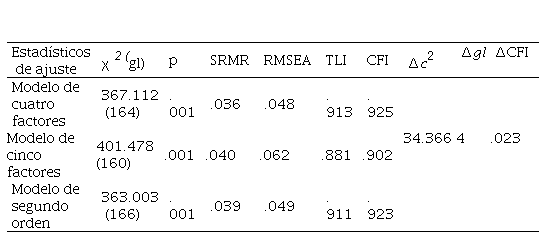 Para el Análisis Factorial Confirmatorio (AFC) y evaluar su ajuste, se tuvieron en cuenta el Índice de Ajuste Comparativo (CFI) y el Índice de Tucker-Lewis (TLI), los cuales deben tener valores por encima de .90; como también el error de aproximación cuadrático medio (RMSEA) y el residuo estandarizado cuadrático medio (SRMR), los cuales deben presentar valores menores de .10 (Bentler, 1992; Byrne, 2010). También se tuvieron en cuenta criterios más exigentes de CFI y TLI mayores de .95 y RMSEA y SRMR menores de .05 (Hu y Bentler, 1999). Que el chi-cuadrado (c2) no sea significativo es un criterio muy exigente y sensible al tamaño de la muestra (Byrne, 2010), por lo cual se dividió el c2 por los grados de libertad del modelo. Aunque no hay criterios unánimes del valor, se establece generalmente que debe ser menor a tres. Se puso a prueba un modelo confirmatorio y, posteriormente, un modelo de segundo orden. Se empleó el modelo Maximum likelihood (ML), tanto para el análisis factorial exploratorio (AFE) como para el AFC, debido a que los valores tenían una distribución normal: la asimetría iba de .054 a 1.001 y la curtosis iba de .156 a .878, ya que valores de 3 y 8 son considerados extremos (Boomsma y Hoogland, 2001; Byrne, 1989; Weston y Gore, 2006). Aunque el formato de respuestas es ordinal, como en muchos otros tests, su distribución normal amerita que se trate a los datos de forma continua (Schmidt et al., 2008). Se comenzó por realizar un análisis factorial exploratorio (un estudio de calibración), para luego realizar un análisis confirmatorio (un estudio de replicación) debido a que no existen estudios a este respecto en la Argentina. Se optó por este enfoque basados en los datos o botton up –primero un exploratorio y luego un confirmatorio– porque se sabe que las estructuras factoriales de un instrumento pueden variar de un estudio a otro o cuando se está en un proceso de adaptación de un test (Fehm y Hoyer, 2004; Wells y Davies, 1994).