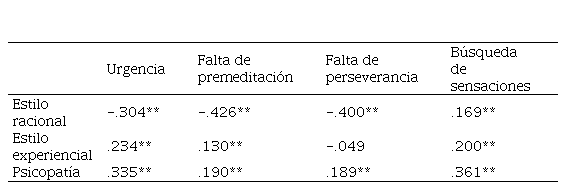 Para analizar la validez convergente, se llevaron a cabo correlaciones de Pearson entre las dimensiones de la impulsividad y ambos factores del Inventario Racional Experiencial, como también entre la impulsividad y la psicopatía. Se hallaron correlaciones significativas de forma esperada entre todas las subescalas de impulsividad y los factores racionales y experienciales. La única excepción fue la falta de asociaciones significativas entre falta de perseverancia y estilo experiencial, como se puede observar en la tabla 3. Las asociaciones resultaron ser positivas entre el estilo experiencial y las restantes tres dimensiones de la impulsividad. El estilo racional presentó una correlación positiva únicamente con la búsqueda de sensaciones, y mostró asociaciones negativas con todas las restantes dimensiones de impulsividad. Según dichas relaciones, a mayor puntaje en impulsividad, excepto en la búsqueda de sensaciones, menor puntaje en estilo racional.
