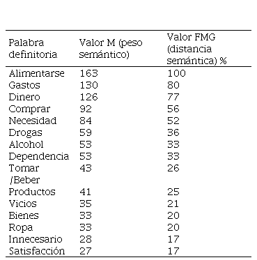 La Tabla 1 muestra el conjunto SAM general de los informantes para la palabra “consumo”. Se observan las 15 palabras definitorias con mayor valor semántico, que definen el concepto. También se presenta su distancia semántica (valor FMG), generada por el grupo total de estudiantes. El valor J, por su parte, indica la riqueza de la red semántica para la palabra “consumo”, que en este análisis es de 129 palabras. El núcleo de la red es la palabra “alimentarse” (100 %), seguido por “gastos” (80 %), “dinero” (77 %), “comprar” (56 %) y “necesidad” (52 %). Luego, están presenten palabras tales como “drogas” (36 %), “alcohol” (33 %), “dependencia” (33 %) y “tomar”/“beber” (26 %). Posteriormente, aparece la palabra “productos” (25 %), seguida por “vicios” (21 %), “bienes” (20 %), “ropa” (20 %), “innecesario” (17 %) y “satisfacción” (17 %).