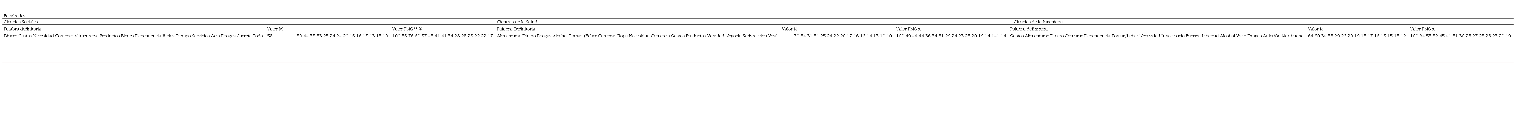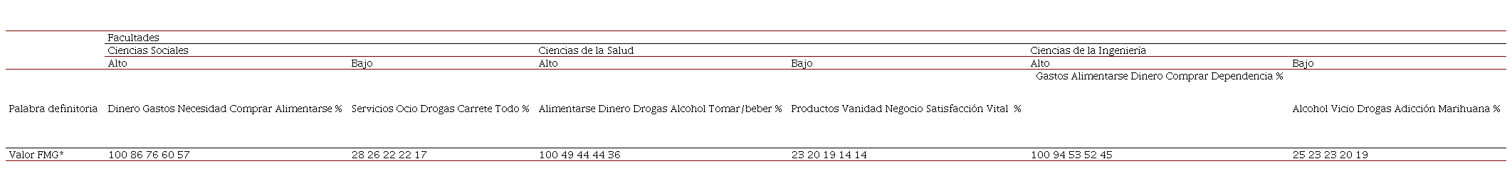 La Tabla 3 agrupa las cinco palabras definitorias más altas de consumo (con mayor peso semántico) y las cinco palabras definitorias más bajas (con menor peso semántico), con el correspondiente valor FMG, según las áreas de formación profesional. Como es posible observar, el núcleo de la red para los estudiantes es diferente según el área profesional. En el caso de la palabra definitoria “alimentarse”, esta se presenta con altos pesos semánticos en los estudiantes de Ciencias de la Salud (100 %), Ciencias de la Ingeniería (94 %) y, en menor medida, en Ciencias Sociales (57 %).