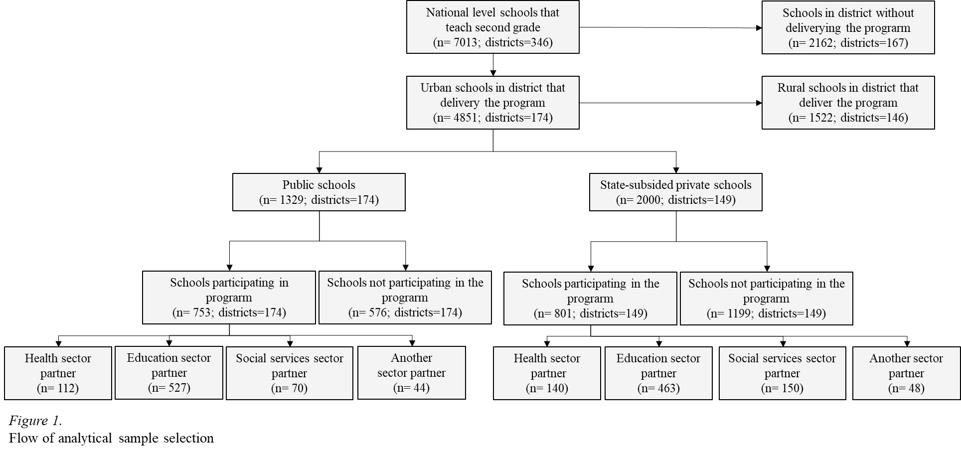 A sequential strategy was used to define the analytical sample. Schools from districts where the CSFL is implemented were selected, and rural schools were discarded in order to reduce geographic and cultural biases. Subsequently, schools were separated into two subsamples, public schools (n = 1 329) and state-subsidized private schools (n = 2 000). Finally, the schools were classified according to their participation in the program (yes.no) and the implementing agencies sector (see Figure 1). Both samples represent the whole population of schools with CSFL and are of adequate size for multiple regression analysis (Knofczynski, & Mundfrom, 2008).