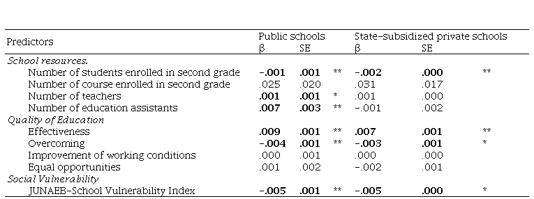 Multiple regressions were performed to evaluate the functional relationship between the covariates and annual school performance. As shown in Table 1, some indicators were found to be significantly associated with school performance in both types of schools, and others were found to be specific only to public schools. The regression weights of the different significant indicators (p < .05 or .01) ranged from -.005 to .009. Although these values are low, their interpretation should consider both the multi-causality of school performance and the scale with which the variable was measured and its dispersion.